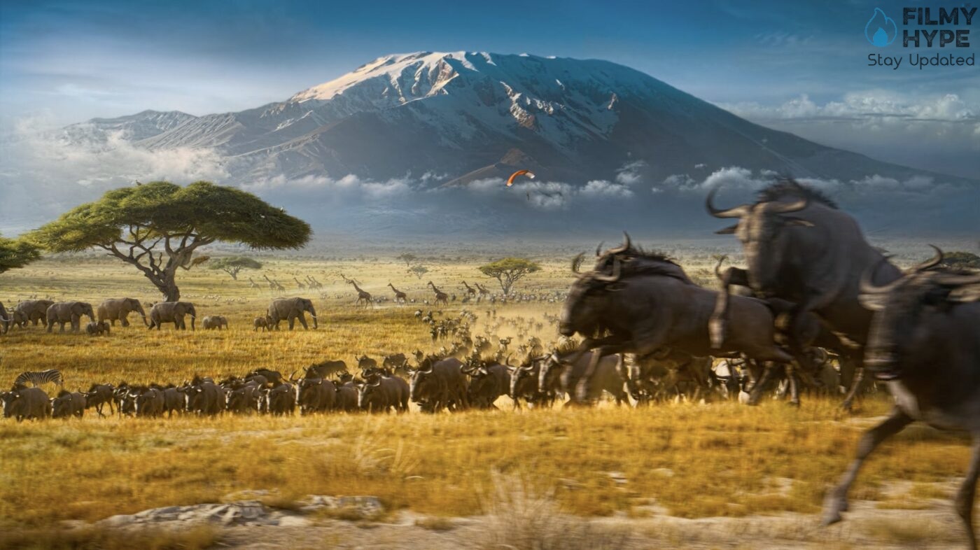 - Skydiving in Africa: Mahesh Babu’s character, Rudhra, paragliding into an African jungle against Mount Kilimanjaro’s snowy backdrop, merges myth with modernity.